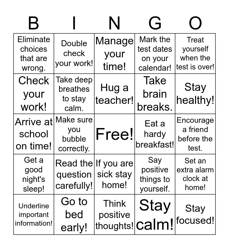 This bingo card has a free space and 24 words: Read the question carefully!, Go to bed early!, Hug a teacher!, Underline important information!, Treat yourself when the test is over!, Eliminate choices that are wrong., Check your work!, Double check your work!, Eat a hardy breakfast!, If you are sick stay home!, Take brain breaks., Arrive at school on time!, Say positive things to yourself., Set an extra alarm clock at home!, Take deep breathes to stay calm., Stay calm!, Encourage a friend before the test., Manage your time!, Stay healthy!, Make sure you bubble correctly., Stay focused!, Get a good night's sleep!, Mark the test dates on your calendar! and Think positive thoughts!.