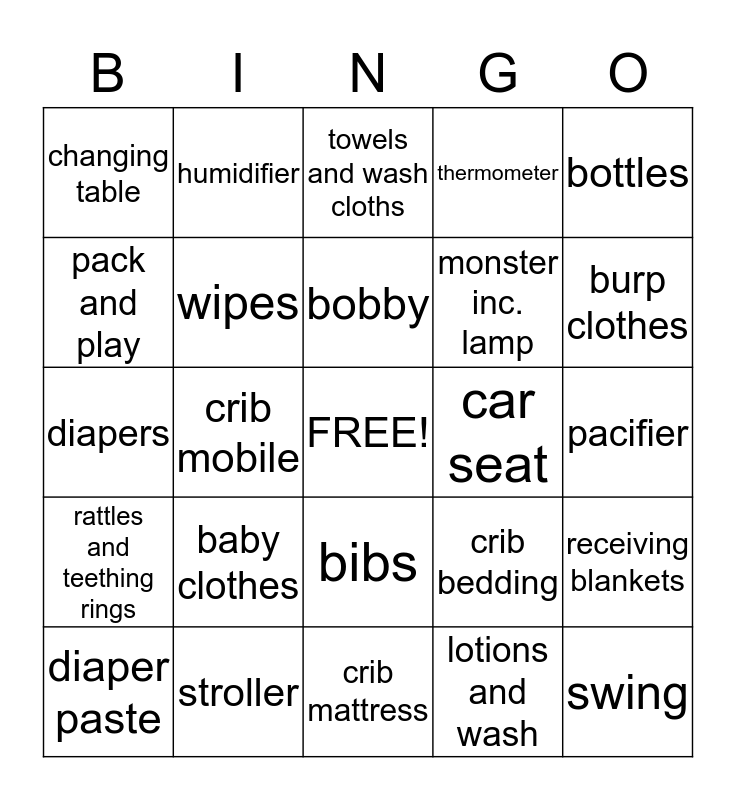 This bingo card has a free space and 24 words: baby clothes, stroller, bobby, diaper paste, bottles, changing table, pack and play, humidifier, car seat, bibs, monster inc. lamp, diapers, crib bedding, receiving blankets, wipes, lotions and wash, pacifier, towels and wash cloths, burp clothes, crib mobile, swing, rattles and teething rings, thermometer and crib mattress.