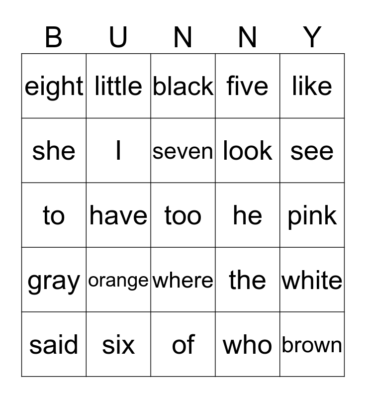 This bingo card has 2 images and 62 words: red, white, a, you, little, for, seven, me, where, yellow, pink, like, do, she, have, eight, this, look, orange, gray, five, my, was, four, nine, what, good, green, purple, can, are, zero, see, said, help, who, blue, I, to, he, one, come, want, too, six, brown, the, and, with, two, of, ten, has, does, black, we, go, is, three, they, here and play.