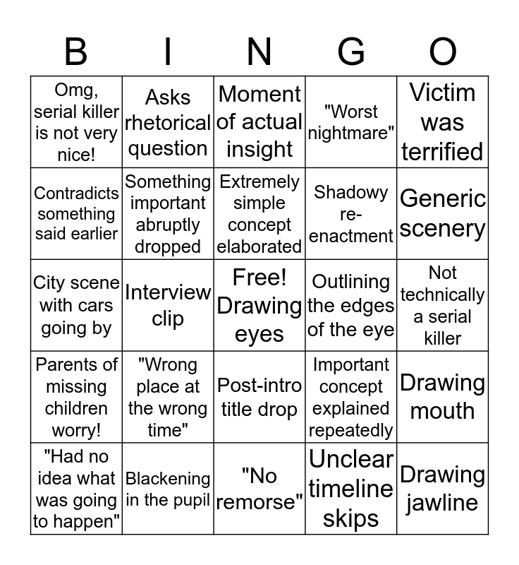 This bingo card has a free space and 24 words: "Wrong place at the wrong time", Blackening in the pupil, Extremely simple concept elaborated, "Had no idea what was going to happen", Victim was terrified, Omg, serial killer is not very nice!, Contradicts something said earlier, Asks rhetorical question, Outlining the edges of the eye, Post-intro title drop, Shadowy re-enactment, City scene with cars going by, Important concept explained repeatedly, Drawing mouth, Something important abruptly dropped, Unclear timeline skips, Not technically a serial killer, Moment of actual insight, Generic scenery, Interview clip, Drawing jawline, Parents of missing children worry!, "Worst nightmare" and "No remorse".