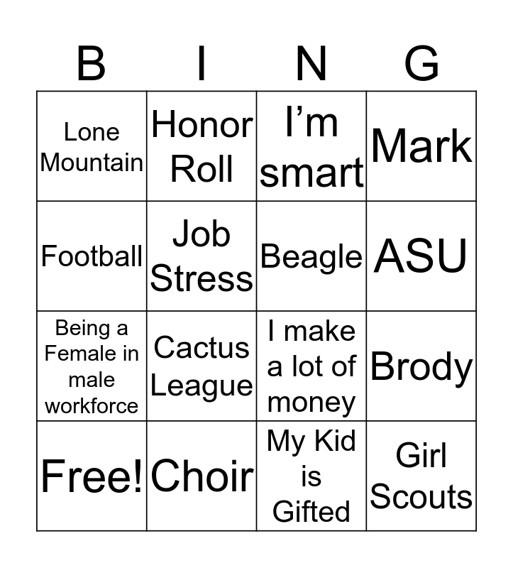This bingo card has 23 words: Girl Scouts, Wells Fargo, ASU, Too busy, Football, Lone Mountain, Job Stress, Honor Roll, Free!, Audiology Issues, Cactus League, Being a Female in male workforce, Kate, Husband, Choir, System Crashes, I’m smart, I make a lot of money, Beagle, Brody, Mark, My Kid is Gifted and Baseball.