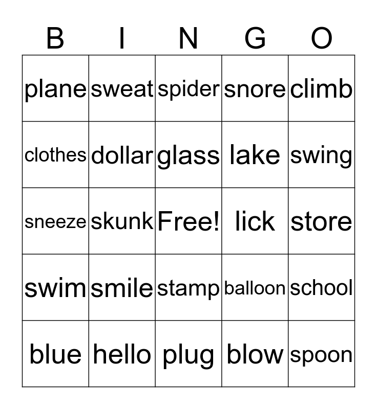 This bingo card has a free space and 24 words: smile, hello, glass, blue, climb, plane, clothes, sweat, lick, stamp, lake, sneeze, balloon, school, dollar, blow, store, spider, swing, skunk, spoon, swim, snore and plug.