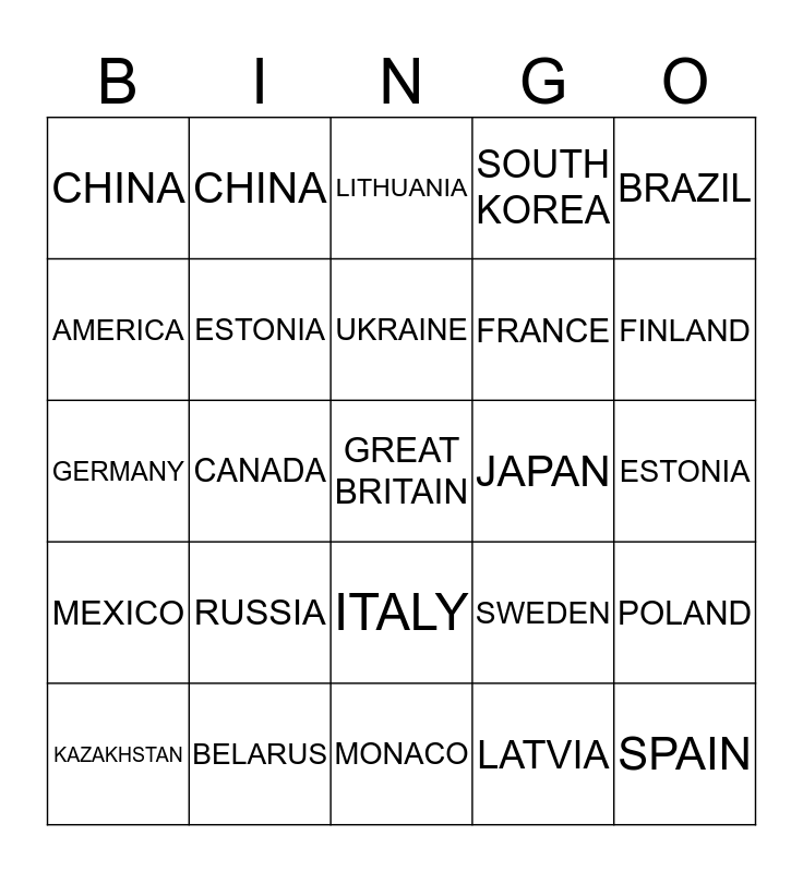 This bingo card has a free space and 24 words: RUSSIA, BELARUS, UKRAINE, KAZAKHSTAN, BRAZIL, CHINA, AMERICA, CHINA, JAPAN, ITALY, FRANCE, GERMANY, SWEDEN, POLAND, ESTONIA, LATVIA, ESTONIA, LITHUANIA, FINLAND, CANADA, SPAIN, MEXICO, SOUTH KOREA and MONACO.