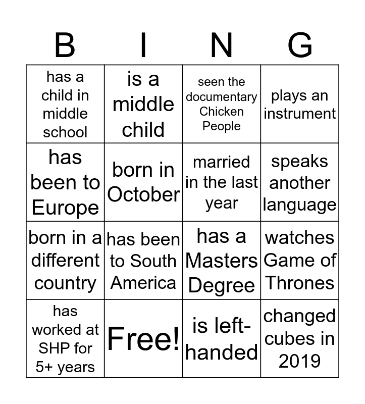 This bingo card has 16 words: Free!, watches Game of Thrones, seen the documentary Chicken People, has a child in middle school, born in a different country, is a middle child, has a Masters Degree, is left-handed, has been to Europe, born in October, has worked at SHP for 5+ years, plays an instrument, has been to South America, speaks another language, married in the last year and changed cubes in 2019.