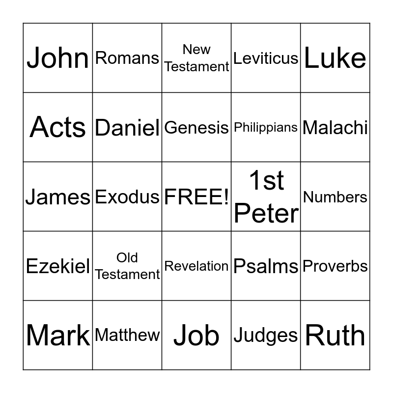 This bingo card has a free space and 24 words: Old Testament, Matthew, Genesis, Mark, Luke, John, Acts, Romans, 1st Peter, Revelation, Philippians, James, Psalms, Proverbs, Daniel, Judges, Numbers, New Testament, Malachi, Exodus, Ruth, Ezekiel, Leviticus and Job.
