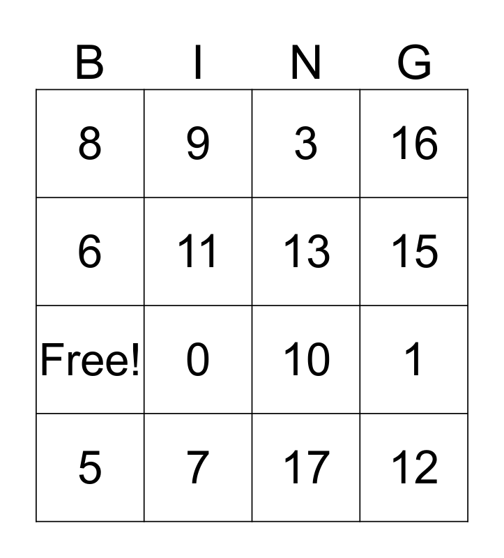 This bingo card has 20 words: 1, 2, 3, 4, 5, 6, 7, 8, Free!, 9, 0, 10, 11, 12, 13, 14, 15, 16, 17 and 18.
