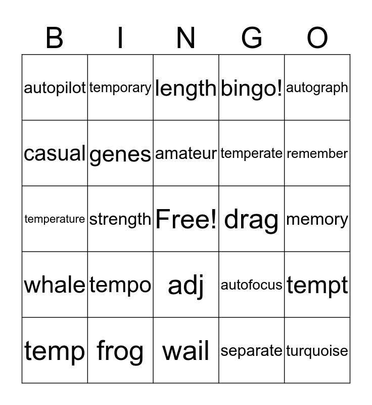 This bingo card has a free space and 24 words: tempo, frog, amateur, temp, autograph, autopilot, casual, temporary, drag, adj, temperate, temperature, autofocus, tempt, genes, separate, memory, length, remember, strength, turquoise, whale, bingo! and wail.