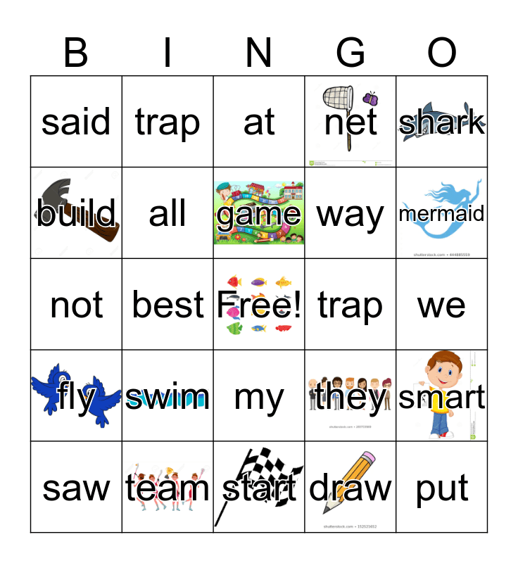 This bingo card has 12 images, a free space and 29 words: saw, days, best, how, said, at, all, swim, trap, team, we, put, start, draw, mermaid, with, my, fly, shark, not, they, come, way, build, net, trap, smart, game and i.