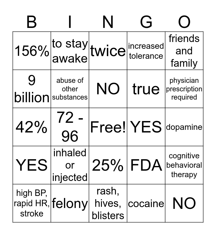 This bingo card has a free space and 34 words: 60%, cocaine, ADHD and narcolepsy, suppress, YES, abuse of other substances, friends and family, high BP, rapid HR, stroke, to stay awake, sudden death, NO, twice, anxiety, paranoia, depression, less likely, YES, physician prescription required, felony, 42%, inhaled or injected, FDA, 25%, brain fog without it, 156%, dopamine, rash, hives, blisters, NO, increased tolerance, marijuana, true, 9 billion, false, 72 - 96, cognitive behavioral therapy and Ritalin, Concerta, Vyvanse.