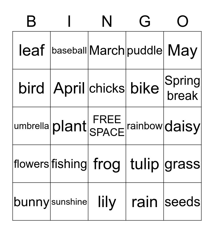 This bingo card has a free space and 34 words: Easter egg, rain, clouds, rain boots, flowers, April, May, bunny, baseball, butterfly, chicks, March, lamb, nest, rainbow, Spring break, sunshine, umbrella, fishing, tulip, frog, tree, leaf, daisy, lily, seeds, puddle, garden, bike, bird, kite, plant, grass and Earth Day.