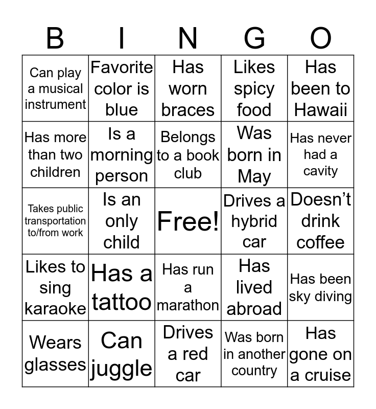 This bingo card has a free space and 47 words: Has blue eyes, Has gone on a cruise, Has a dog, Drives a red car, Has a tattoo, Is left handed, Favorite color is blue, Speaks a second language, Has more than two children, Plays on a sports team, Is a morning person, Likes spicy food, Has been sky diving, Has lived abroad, Has played in a band, Is afraid of spiders, Belongs to a book club, Drives a hybrid car, Likes anchovies, Has been to Hawaii, Is an only child, Was born in another country, Can play a musical instrument, Was born in May, Is wearing earrings, Has never had a cavity, Wears glasses, Is in a Fantasy Football league, Has run a marathon, Likes to sing karaoke, Has met a celebrity, Doesn’t like chocolate, Rides a motorcycle, Is afraid of heights, Loves to cook, Can juggle, Doesn’t drink coffee, Has never been to Disney World, Has a cat, Had a baby this year, Plays golf, Has worn braces, Takes public transportation to/from work, Lives in the city, Lives in the suburbs, Watches reality TV and Has a $100 bill in their wallet.