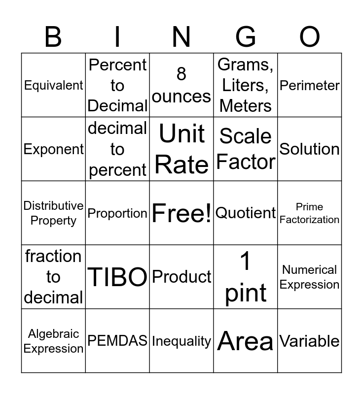 This bingo card has a free space and 29 words: Algebraic Expression, Equation, Proportion, Percent, Equivalent, 8 ounces, decimal to percent, TIBO, Quotient, PEMDAS, Prime Factorization, Variable, Inequality, Area, Solution, 1 meter, Product, fraction to decimal, Perimeter, Distributive Property, 1 pint, Rate, Scale Factor, Exponent, Grams, Liters, Meters, Percent to Decimal, Numerical Expression, Unit Rate and Prime Number.