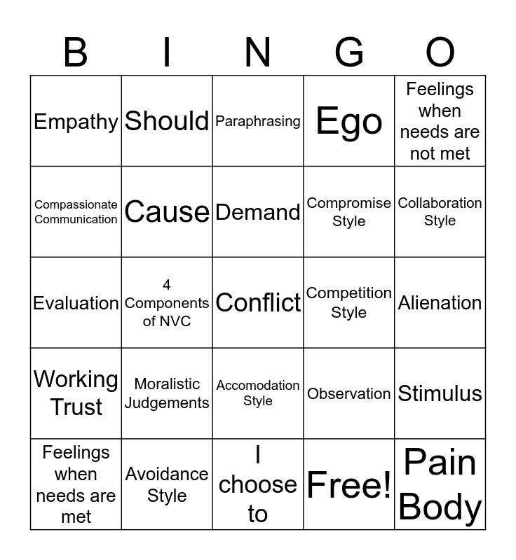 This bingo card has 25 words: Moralistic Judgements, I choose to, Demand, Feelings when needs are met, Feelings when needs are not met, Empathy, Compassionate Communication, Should, Competition Style, Accomodation Style, Compromise Style, Evaluation, Observation, Stimulus, Cause, Pain Body, Alienation, Paraphrasing, Collaboration Style, 4 Components of NVC, Conflict, Avoidance Style, Working Trust, Ego and Free!.
