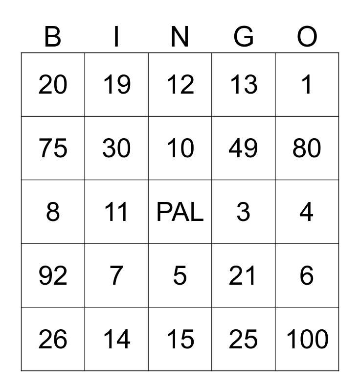 This bingo card has a free space and 24 words: 7, 14, 10, 26, 1, 20, 75, 19, 3, 5, 49, 8, 21, 6, 30, 25, 4, 12, 80, 11, 100, 92, 13 and 15.