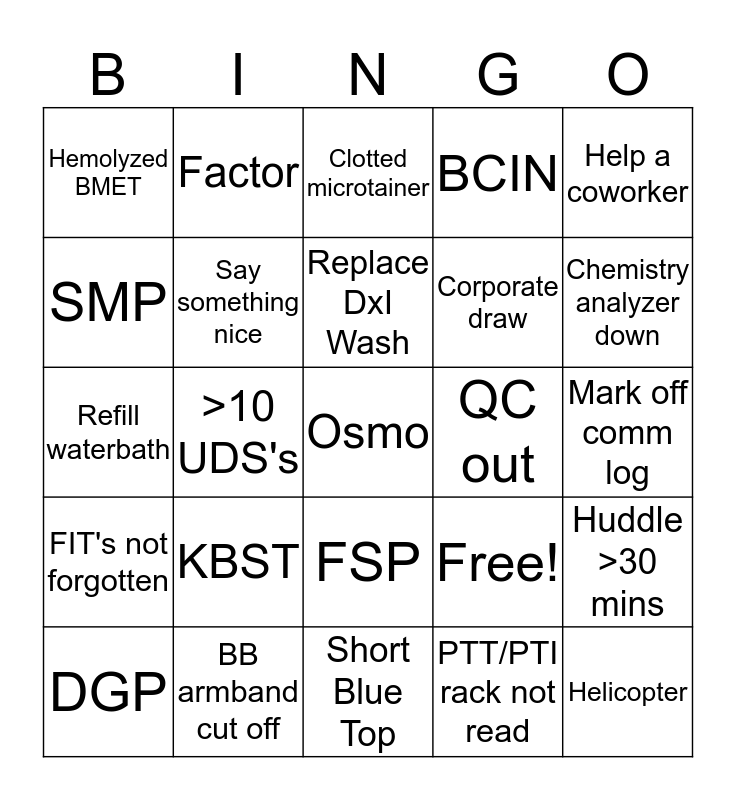 This bingo card has 25 words: KBST, Short Blue Top, Replace DxI Wash, DGP, Help a coworker, Hemolyzed BMET, SMP, Factor, QC out, FSP, Corporate draw, Refill waterbath, Free!, Huddle >30 mins, Say something nice, Helicopter, Mark off comm log, Clotted microtainer, Chemistry analyzer down, >10 UDS's, Osmo, BB armband cut off, FIT's not forgotten, BCIN and PTT/PTI rack not read.