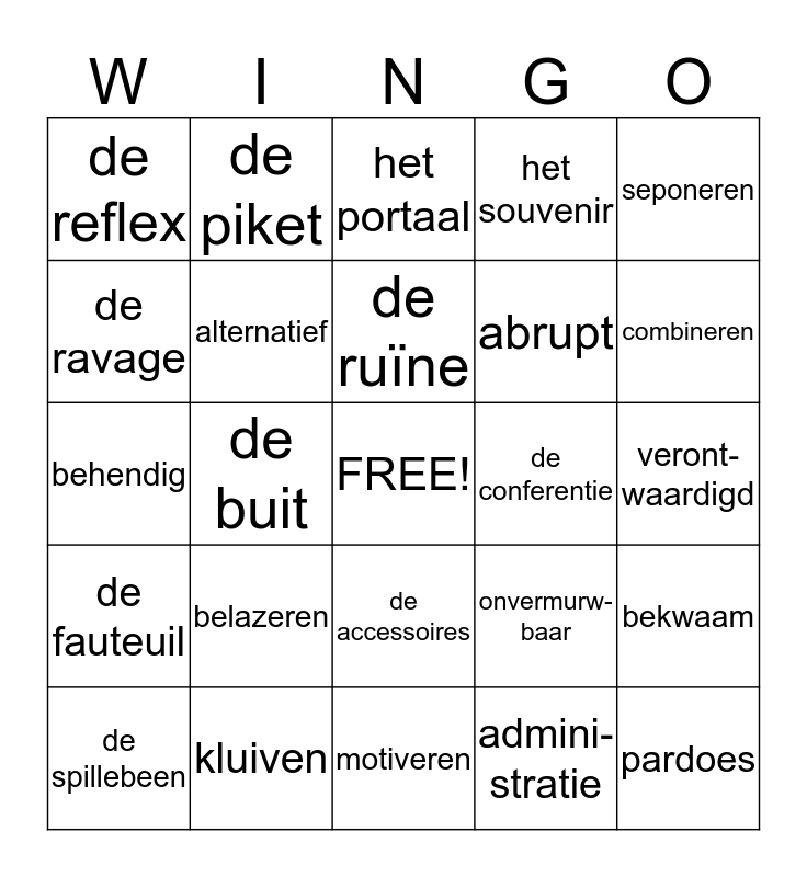 This bingo card has a free space and 24 words: belazeren, kluiven, de ruïne, de spillebeen, seponeren, de reflex, de ravage, de piket, de conferentie, de accessoires, abrupt, behendig, onvermurw-baar, bekwaam, alternatief, admini-stratie, veront- waardigd, het portaal, combineren, de buit, pardoes, de fauteuil, het souvenir and motiveren.