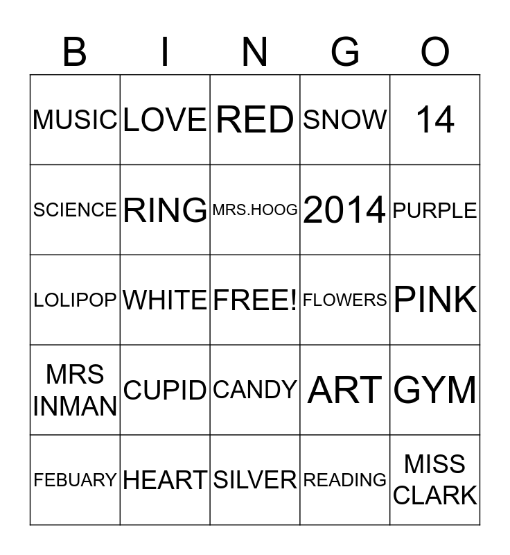 This bingo card has a free space and 24 words: CUPID, HEART, MRS.HOOG, FEBUARY, 14, MUSIC, SCIENCE, LOVE, FLOWERS, CANDY, 2014, LOLIPOP, ART, GYM, RING, READING, PINK, RED, PURPLE, WHITE, MISS CLARK, MRS INMAN, SNOW and SILVER.