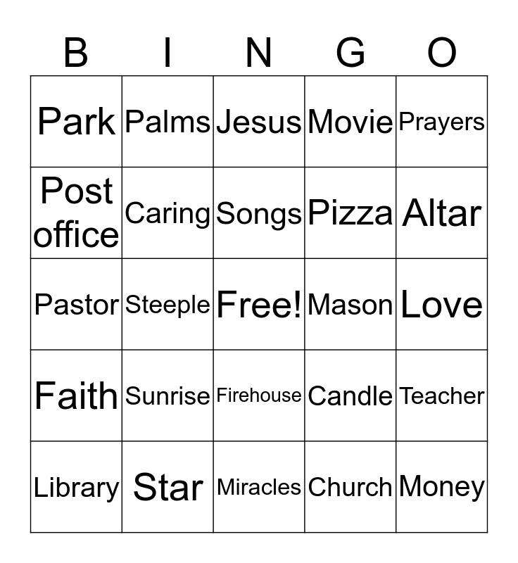 This bingo card has a free space and 64 words: Wine, Roof, Projector, Teacher, School, Lake, Palms, Piano, Songs, Sunday, Firehouse, Bread, Love, Prayers, Methodist, Post office, Steeple, Park, Baseball, Pizza, Sunrise, Faith, Movie, Money, Streets, Baptist, Methodist, Telephone, Historical, Bible, Town, Choir, Friendship, Bells, Altar, Library, Cemetery, Church, Organ, Caring, Pastor, Mason, Sidewalk, Pantry, Pledge, Money, Star, Group, Candle, Bank, Water, Cross, Miracles, Offices, Healing, Health, Jesus, Mary, Speaker, Church St, Plum St, Main St, Director and Pews.