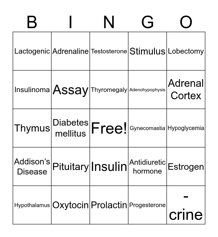 This bingo card has a free space and 24 words: Pituitary, Oxytocin, Thyromegaly, Hypothalamus, Lobectomy, Lactogenic, Insulinoma, Adrenaline, Gynecomastia, Insulin, Adenohypophysis, Thymus, Antidiuretic hormone, Estrogen, Assay, Progesterone, Hypoglycemia, Testosterone, Adrenal Cortex, Diabetes mellitus, -crine, Addison’s Disease, Stimulus and Prolactin.
