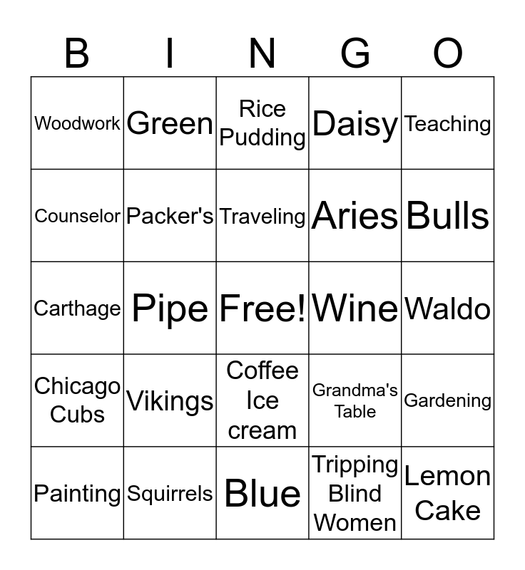 This bingo card has a free space and 24 words: Vikings, Squirrels, Traveling, Painting, Teaching, Woodwork, Counselor, Green, Wine, Coffee Ice cream, Aries, Carthage, Grandma's Table, Gardening, Packer's, Tripping Blind Women, Waldo, Rice Pudding, Bulls, Pipe, Lemon Cake, Chicago Cubs, Daisy and Blue.