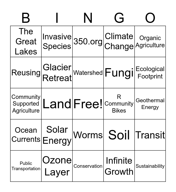 This bingo card has a free space and 79 words: Mycoremediation, Rachel Carson, 350.org, Bill McKibben, Carbon Dioxide, Green New Deal, Biodiversity, Environmental Protection Agency, Green Party, Plastics, Earthworms, Story of Stuff, Climate Change, The Great Lakes, Recycling, Reusing, Right to Repair, Solar Energy, Wind Energy, Geothermal Energy, Fracking, Organic Agriculture, Community Supported Agriculture, Watershed, Glacier Retreat, Ecosystem, Climate vs. Weather, Biodegradable, Compost, Consumption, Ecological Footprint, Fossil Fuel, Conservation, Hazardous Waste, Public Transportation, R Community Bikes, RPCC, Mothers Out Front, Greenovation, Sustainability, Oil, Coal, Arborist, Asthma, Greenhouse Effect, Invasive Species, Fire, Greenwashing, Climate Survivalist, Children, Transit, Land, Soil, Displacement, Keystone Species, Polar Ice Caps, Horticulture, Soil Bacteria, Mycorrhiza, Worms, Fungi, Resiliency, Brown Field, Erosion, Acid Rain, Glaciers, Pollution, Plants, Rain Forrest, Ocean Currents, Ozone Layer, Coral Reefs, Groundwater, Environmental Racism, Nuclear Energy, Infinite Growth, Deforestation, Wetlands and Desertification.