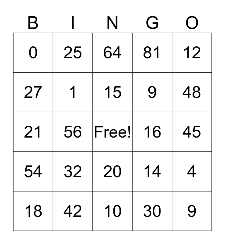 This bingo card has a free space and 24 words: 32, 42, 15, 18, 12, 0, 27, 25, 16, 20, 9, 21, 14, 4, 1, 30, 45, 64, 48, 56, 9, 54, 81 and 10.