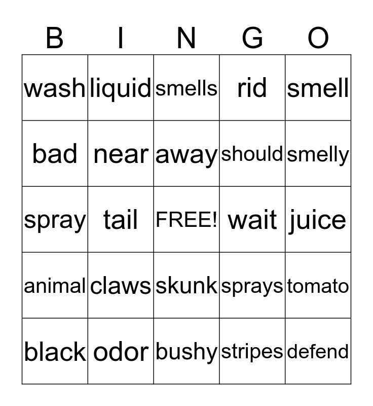 This bingo card has a free space and 24 words: claws, odor, away, black, smell, wash, bad, liquid, wait, skunk, should, spray, sprays, tomato, near, stripes, juice, smells, smelly, tail, defend, animal, rid and bushy.