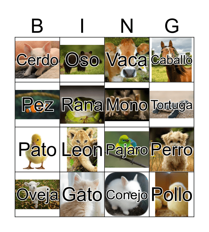 This bingo card has 16 images and 16 words: Gato, Perro, Vaca, Cerdo, Pato, Oso, Pajaro, Conejo, Pez, Rana, Oveja, Caballo, Leon, Tortuga, Mono and Pollo.