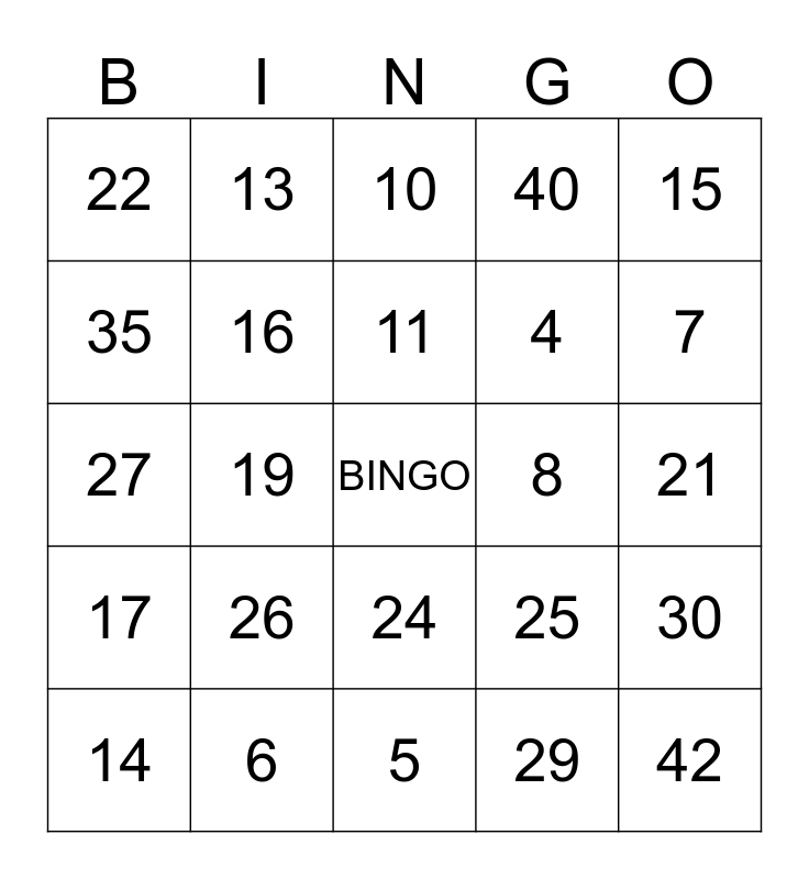 This bingo card has a free space and 33 words: 20, 2, 19, 18, 17, 16, 15, 14, 13, 12, 11, 10, 1, 9, 8, 7, 6, 27, 26, 25, 24, 23, 22, 21, 5, 42, 40, 4, 35, 30, 3, 29 and 28.