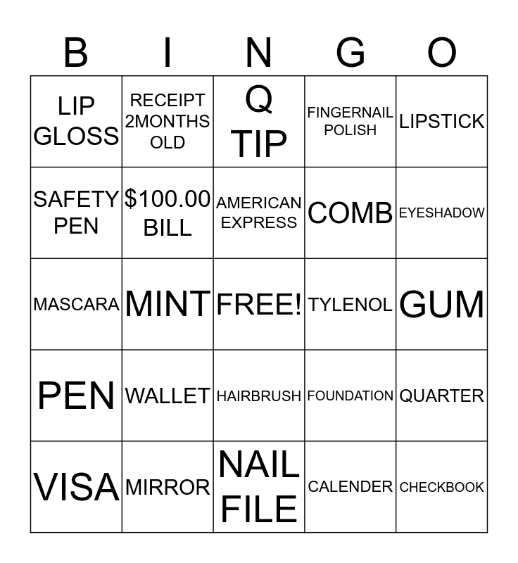 This bingo card has a free space and 24 words: WALLET, MIRROR, AMERICAN EXPRESS, VISA, LIPSTICK, LIP GLOSS, SAFETY PEN, RECEIPT 2MONTHS OLD, TYLENOL, HAIRBRUSH, COMB, MASCARA, FOUNDATION, QUARTER, $100.00 BILL, CALENDER, GUM, Q TIP, EYESHADOW, MINT, CHECKBOOK, PEN, FINGERNAIL POLISH and NAIL FILE.