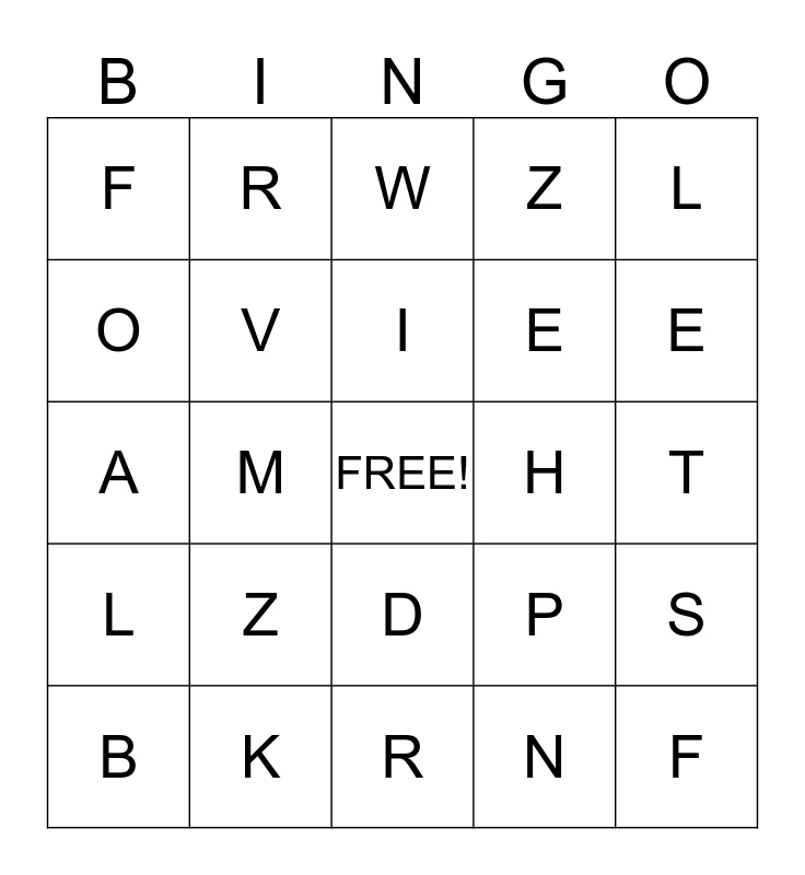 This bingo card has a free space and 24 words: Z, K, I, B, L, F, O, R, H, D, E, A, P, S, V, N, T, W, E, M, F, L, Z and R.
