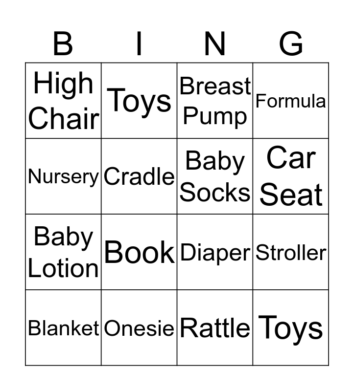This bingo card has 26 words: Free!, Bottle, Car Seat, Play- Pen, Nursery, High Chair, Cradle, Toys, Rattle, Baby Powder, Baby Lotion, Diaper, Pacifier, Booties, Stroller, Teething Ring, Formula, Toys, Breast Pump, Blanket, Book, Baby Bouncer, Onesie, Burp Cloth, Baby Socks and Hooded Towel.