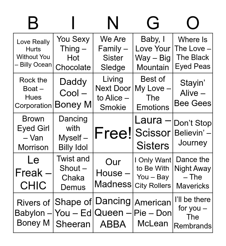 This bingo card has a free space and 45 words: Oh, Pretty Woman – Roy Orbison, I’ll be there for you – The Rembrands, It’s Not Unusual – Tom Jones, Rivers of Babylon – Boney M, Penny Arcade – Roy Orbison, American Pie – Don McLean, We Are Family – Sister Sledge, Back for Good – Take That, Where Is The Love – The Black Eyed Peas, Shape of You – Ed Sheeran, Baby, I Love Your Way – Big Mountain, Laura – Scissor Sisters, Our House – Madness, Twist and Shout – Chaka Demus, Shang-a-Lang – Bay City Rollers, Dancing Queen – ABBA, Sweet Caroline – Neil Diamond, Brown Eyed Girl – Van Morrison, Bye Bye Baby – Bay City Rollers, Stayin’ Alive – Bee Gees, You Sexy Thing – Hot Chocolate, Walking on Sunshine – Katrina & The Waves, I’m a Believer – The Monkes, Love Really Hurts Without You – Billy Ocean, Uptown Girl – Billy Joel, Don’t Stop Believin’ – Journey, Blame it on the Boogie – The Jacksons, I Love to Love – Tina Charles, I Only Want to Be With You – Bay City Rollers, Le Freak – CHIC, Night Fever – Bee Gees, Dance the Night Away – The Mavericks, I Wanna Be the Only One – Eternal, I Wanna Dance with Somebody – Whitney Houston, The Rhythm of the Night – Corona, Dancing with Myself – Billy Idol, Saturday Night at the Movies – The Drifters, I’m in the Mood – The Nolans, Yes Sir, I can Boogie – Baccara, Living Next Door to Alice – Smokie, Rock the Boat – Hues Corporation, Best of My Love – The Emotions, Boogie Wonderland – Earth, Wind and Fire, Daddy Cool – Boney M and Burning Love – Elvis Presley.