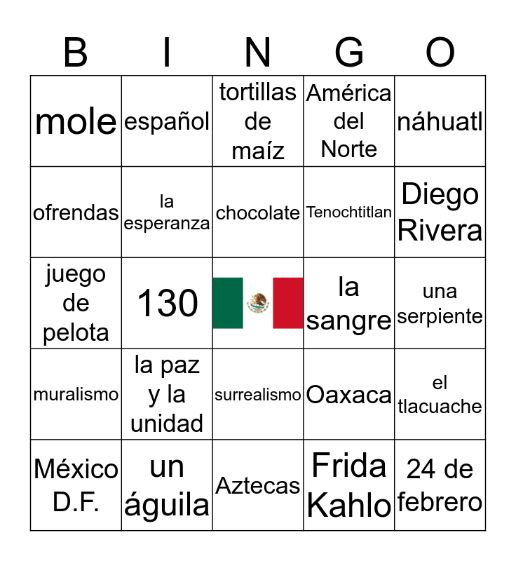 This bingo card has a free space and 29 words: México D.F., 31, 130, tamales, mole, tortillas de maíz, la esperanza, la paz y la unidad, la sangre, un águila, una serpiente, 24 de febrero, Aztecas, Frida Kahlo, Diego Rivera, autorretratos, surrealismo, muralismo, náhuatl, juego de pelota, Oaxaca, Guelaguetza, Tenochtitlan, ofrendas, América del Norte, español, el tlacuache, chocolate and el peso.