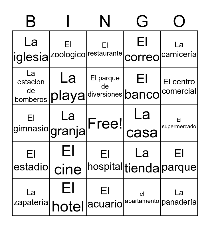 This bingo card has a free space and 31 words: El acuario, La escuela, La granja, El museo, La iglesia, El restaurante, La playa, La tienda, La casa, el apartamento, El supermercado, La panadería, La gasolinera, La biblioteca, El centro comercial, La piscina, El parque, El cine, El estadio, El hospital, La carnicería, El aeropuerto, La zapatería, El zoologico, El banco, La estacion de bomberos, El correo, El gimnasio, El hotel, El parque de diversiones and El cemetario.