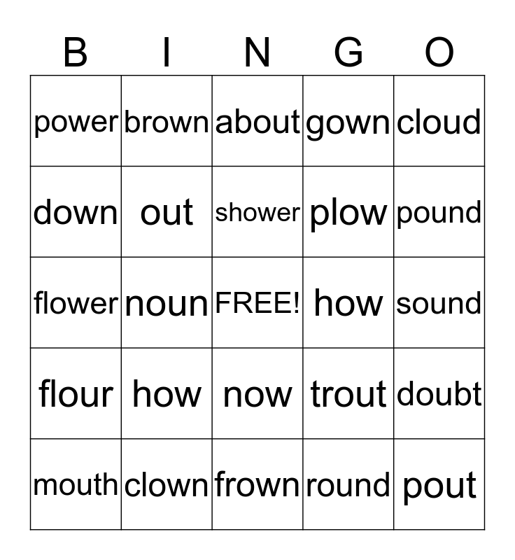 This bingo card has a free space and 24 words: how, clown, shower, mouth, cloud, power, down, brown, how, now, plow, flower, trout, doubt, out, round, sound, about, pound, noun, pout, flour, gown and frown.