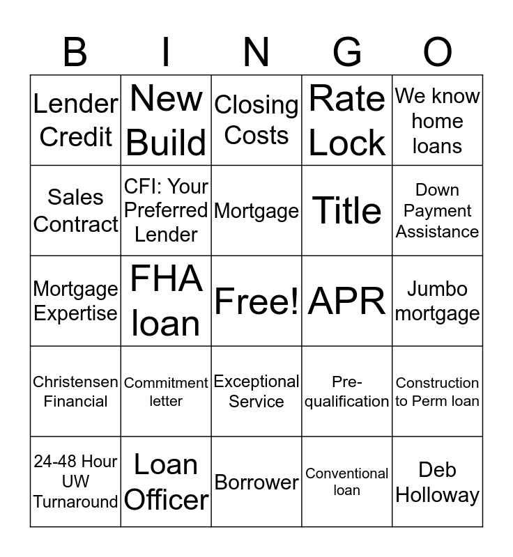 This bingo card has a free space and 32 words: Conventional loan, VA 0% Down loan, FHA loan, Down Payment, Christensen Financial, CFI: Your Preferred Lender, We know home loans, Construction to Perm loan, New Build, Realtor, Mortgage, Closing Costs, Appraisal, Clear to Close, APR, Great Interest Rates, 24-48 Hour UW Turnaround, Mortgage Expertise, Exceptional Service, Commitment letter, Pre-qualification, Pre-Approval, Jumbo mortgage, Loan Officer, Deb Holloway, Rate Lock, Title, Sales Contract, Lender Credit, Borrower, 1003 Application and Down Payment Assistance.