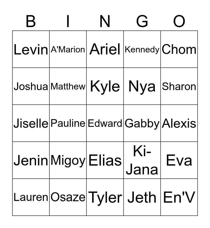 This bingo card has 30 words: Osaze, Kelsey, Pauline, Danyla, Levin, Ariel, Matthew, Elias, Gabby, Tyler, Alexis, Edward, Jeth, En'V, Sharon, Derrick, Ki-Jana, Jenin, Migoy, Chom, Jiselle, Toto, A'Marion, Nya, Joshua, Kennedy, Eva, Lauren, Kyle and Karson.