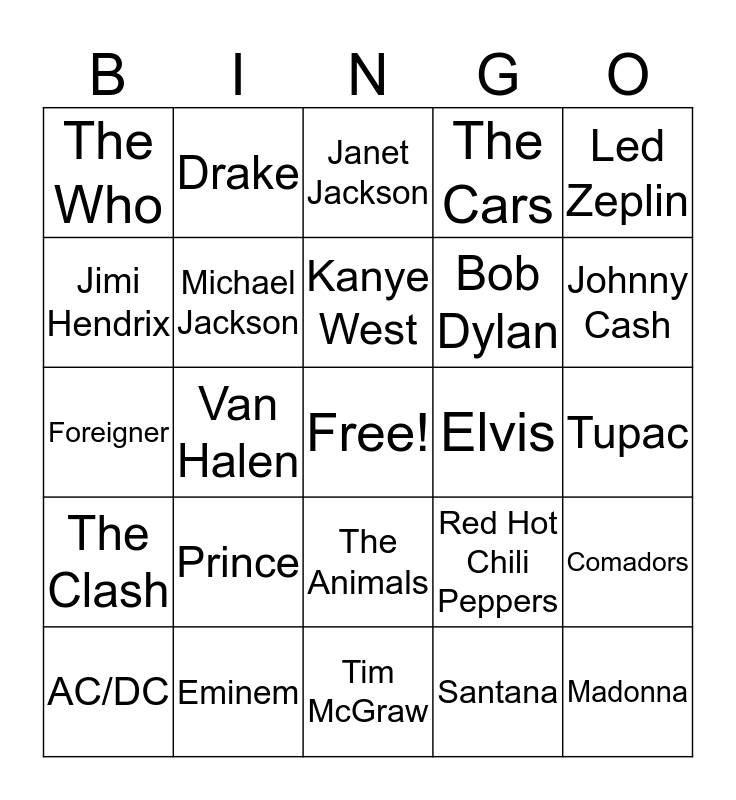 This bingo card has a free space and 29 words: AC/DC, The Beatles, Van Halen, Journey, The Who, Janet Jackson, Michael Jackson, Prince, Elvis, Eminem, Tupac, Madonna, Tim McGraw, Santana, Johnny Cash, Hall Oates, The Animals, The Clash, Led Zeplin, Foreigner, Red Hot Chili Peppers, Metallica, Bob Dylan, Jimi Hendrix, The Cars, Drake, Comadors, Kanye West and Kenny Chesney.