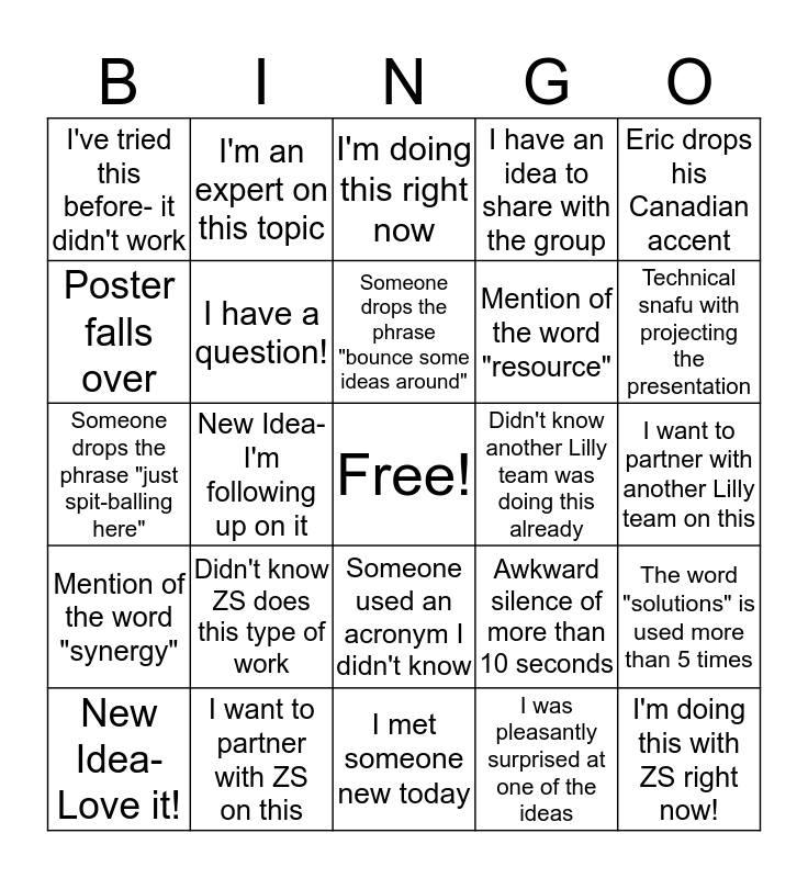 This bingo card has a free space and 29 words: New Idea- Love it!, New Idea- Skeptical, New Idea- I'm following up on it, Heard of this before, but haven't tried, I've tried this before- it didn't work, I'm doing this right now, I have a question!, Didn't know ZS does this type of work, Didn't know another Lilly team was doing this already, I want to partner with ZS on this, I want to partner with another Lilly team on this, I'm doing this with ZS right now!, I met someone new today, I was pleasantly surprised at one of the ideas, Technical snafu with projecting the presentation, Marker for the poster didn't work, Someone used an acronym I didn't know, Mention of the word "synergy", Eric drops his Canadian accent, Someone drops the phrase "just spit-balling here", Awkward silence of more than 10 seconds, Someone drops the phrase "win-win", Mention of the word "resource", Poster falls over, I have an idea to share with the group, I'm an expert on this topic, The word "solutions" is used more than 5 times, Someone drops the phrase "bounce some ideas around" and I've tried this before- it worked beautifully!.