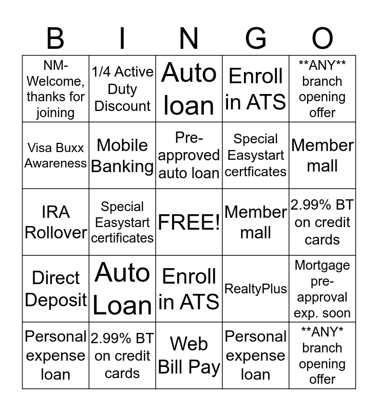 This bingo card has a free space and 24 words: Auto Loan, 2.99% BT on credit cards, Pre-approved auto loan, Personal expense loan, **ANY** branch opening offer, NM- Welcome, thanks for joining, Visa Buxx Awareness, 1/4 Active Duty Discount, Member mall, Enroll in ATS, Special Easystart certficates, IRA Rollover, RealtyPlus, Mortgage pre-approval exp. soon, Mobile Banking, Personal expense loan, 2.99% BT on credit cards, Auto loan, Member mall, Special Easystart certificates, **ANY* branch opening offer, Direct Deposit, Enroll in ATS and Web Bill Pay.