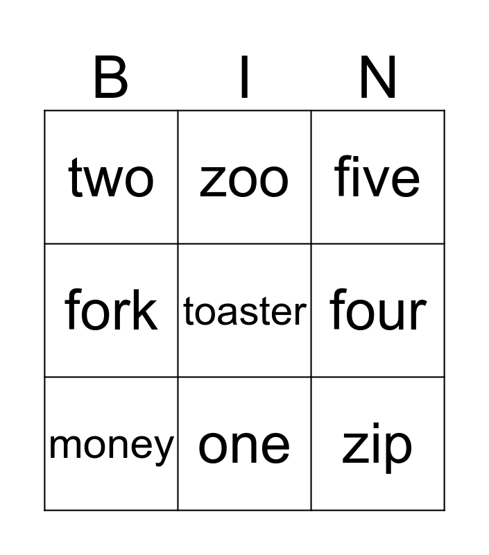 This bingo card has a free space and 14 words: guitar, worm, money, zoo, fork, zip, vegetables, watch, one, two, three, four, five and six.