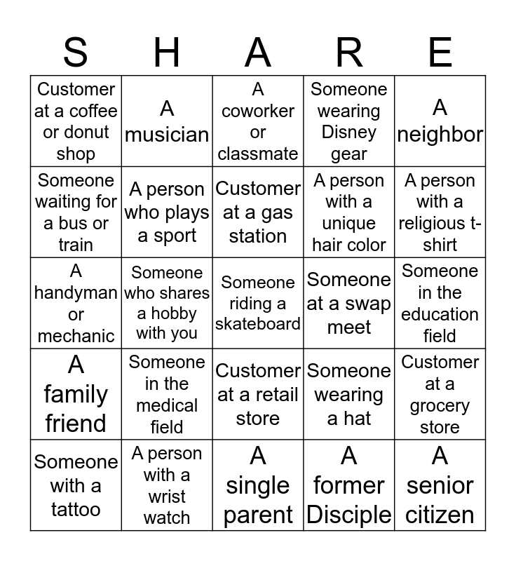 This bingo card has 25 words: Someone in the medical field, A single parent, Customer at a gas station, Someone with a tattoo, A neighbor, Customer at a coffee or donut shop, Someone waiting for a bus or train, A musician, Someone at a swap meet, Customer at a retail store, A person with a unique hair color, A handyman or mechanic, Someone wearing a hat, Customer at a grocery store, A person who plays a sport, A senior citizen, Someone in the education field, A coworker or classmate, A person with a religious t-shirt, Someone who shares a hobby with you, Someone riding a skateboard, A person with a wrist watch, A family friend, Someone wearing Disney gear and A former Disciple.