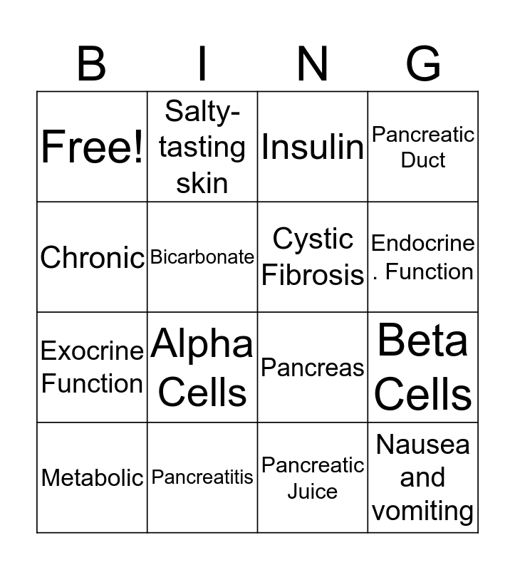 This bingo card has 19 words: Metabolic, Digestive, Insulin, Beta Cells, Glucagon, Salty-tasting skin, Pancreatic Juice, Pancreatic Duct, Free!, Alpha Cells, Cystic Fibrosis, Endocrine . Function, Exocrine Function, Pancreatitis, Pancreas, Nausea and vomiting, Chronic, Bicarbonate and Acute.