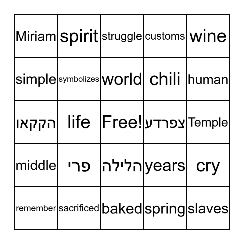 This bingo card has a free space and 24 words: פרי, sacrificed, world, remember, wine, Miriam, simple, spirit, צפרדע, הלילה, chili, הקקאו, years, cry, symbolizes, spring, Temple, struggle, human, life, slaves, middle, customs and baked.