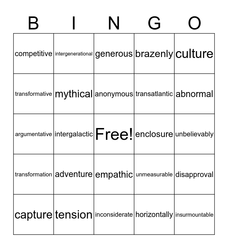 This bingo card has a free space and 24 words: adventure, tension, anonymous, capture, culture, competitive, transformative, intergenerational, enclosure, empathic, transatlantic, argumentative, unmeasurable, disapproval, mythical, horizontally, unbelievably, generous, abnormal, intergalactic, insurmountable, transformation, brazenly and inconsiderate.