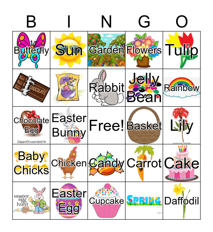 This bingo card has 24 images, a free space and 20 words: Chicken, Easter Egg, Rabbit, Tulip, Butterfly, Sun, Basket, Candy, Jelly Bean, Chocolate Egg, Carrot, Cake, Lily, Garden, Rainbow, Easter Bunny, Daffodil, Baby Chicks, Flowers and Cupcake.
