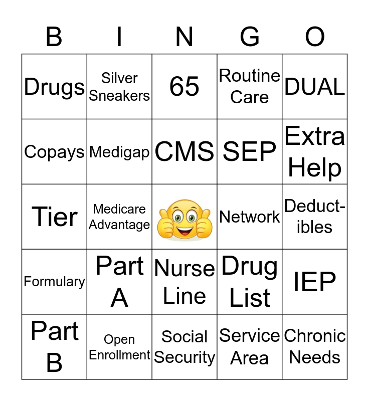 This bingo card has a free space and 29 words: Part D, Open Enrollment, 65, PDP, DUAL, Drugs, Medigap, CMS, Network, IEP, Part B, Medicare Advantage, Service Area, Chronic Needs, Tier, Late Enroll-ment Penalty, Social Security, Drug List, Extra Help, Formulary, Part A, Aging In, SEP, Deduct- ibles, Copays, Silver Sneakers, Nurse Line, Routine Care and Preventive Services.