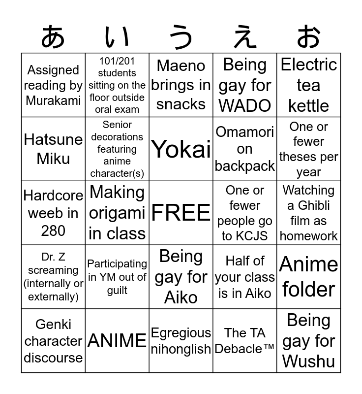 This bingo card has a free space and 34 words: Sushi at an event, The TA Debacle™, Running out of JPN classes to take, Goree mentions Edo, Dr. Z screaming (internally or externally), Senior decorations featuring anime character(s), Electric tea kettle, Genki character discourse, 101/201 students sitting on the floor outside oral exam, First year tests into 232, Yokai, Maeno brings in snacks, Maeno's daughter makes an appearance, Studying abroad at ICU, One or fewer people go to KCJS, One or fewer theses per year, ANIME, Hardcore weeb in 280, Participating in YM out of guilt, Half of your class is in Aiko, Being gay for Aiko, Gudetama stickers, Assigned reading by Murakami, Watching a Ghibli film as homework, Egregious nihonglish, Being gay for Wushu, Being gay for WADO, WAA sticker on laptop, Omamori on backpack, Hatsune Miku, Crowd of non-majors at Japan Club study break, Making origami in class, Anime folder and One Billion Flash Cards.