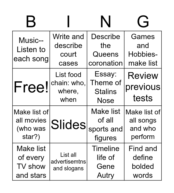 This bingo card has 16 words: List all advertisemtns and slogans, Make list of all songs and who perform, Describe the Queens coronation, Music--Listen to each song, Make list of all movies (who was star?), Write and describe court cases, Make list of all sports and figures, Timeline life of Gene Autry, Free!, List food chain: who, where, when, Make list of every TV show and stars, Games and Hobbies-make list, Slides, Review previous tests, Essay: Theme of Stalins Nose and Find and define bolded words.